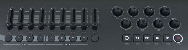 С правой стороны от экрана расположены назначаемые контроллеры. В отличии от младшей модели Axiom 61 оснащена девятью фейдерами. Расположенные под ними кнопки также являются назначаемыми. Вращающиеся регуляторы выполнены дискретными и без ограничителя. Кнопки транспортной панели для удобства имеют яркие обозначения.
