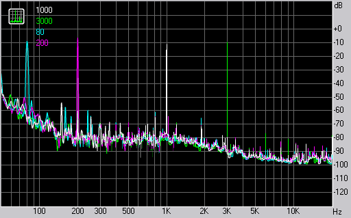 Уровень искажений на средней громкости весьма неплох во всем диапазоне частот. На графике можно видеть спектр в нескольких контрольных точках. На НЧ, увы, традиционно много искажений, а низкие искажения на ВЧ впечатляют.