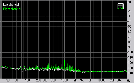 Спектр шумов в режиме 24 бит показывает отсутствие каких-либо серьезных проблем — уровень помех лежит ниже теоретического предела для 16-битного сигнала. В режиме loopback вид noise floor спектра абсолютно плоский, что наводит на мысль о небольших наводках от земляной петли в данном случае.