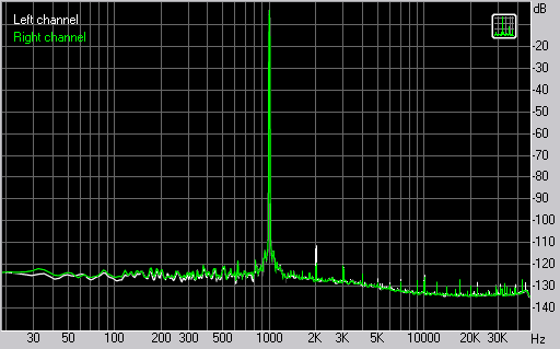 Спектр гармоник — абсолютно чистый. 0.0005% КГИ, для суммы всех 20 гармоник — фантастические показатели. КГИ+шум также весьма впечатляет, -91 дБ.