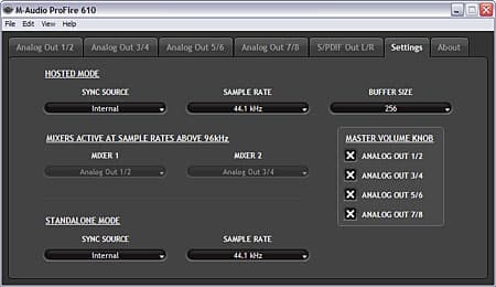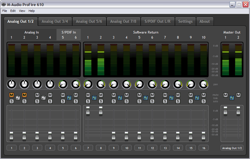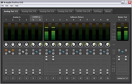 Интерфейсы ProFire имеют новую концепцию раздельных миксов на каждом выходе. То, что давно есть в проф интерфейсах других производителей, теперь есть и у M-Audio. Нам понравились пикметры с фиксацией и плавным спадом пикового значения. Также показалась интересной логарифмическая шкала уровня с нестандартным расширенным диапазоном для более удобного контроля пиков. Треть шкалы занимает диапазон от 0 до -3 дБ, остальные две третьих от -3 до -50 дБ.
