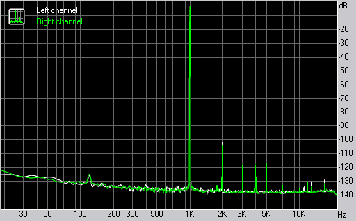 Измерения интерфейса в loopback входа 3/4 показывают динамический диапазон 107 дБА в режиме 24 бит 44 кГц. Вход 1/2 из-за наличия предусилителей демонстирует несколько меньшие показатели, 103 дБА. В целом, измерения подтверждают заявленные паспортные данные ProFire 610. Можно даже сказать, что паспортные данные производителем округлены до гарантированного значения — в реальности цифры получились даже лучше.