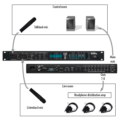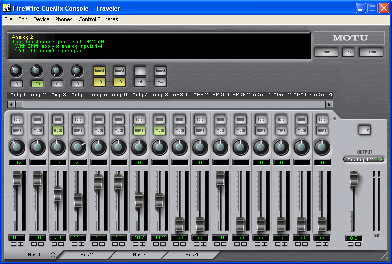 В Traveler предусмотрена возможность одновременно посылать на разные физические выходы четыре различных конфигурации микшера (Bus). Эта функция предназначена для удобства работы звукорежиссера при записи живых исполнителей и музыкантов. Также предусмотрена функция обратной связи Talkback и Listenback для общения между звукорежиссером и записываемым исполнителем.