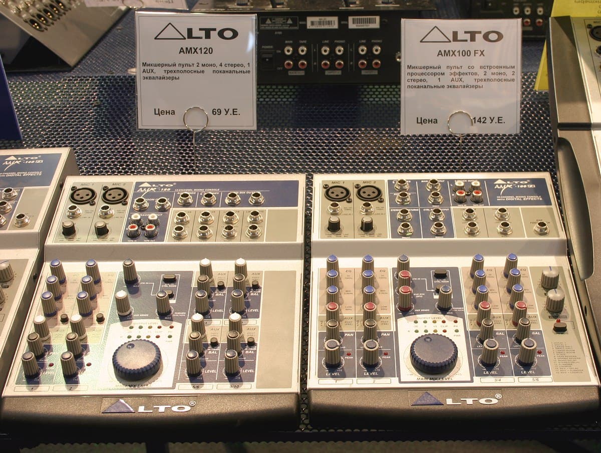 Заканчивая тему микшерных пультов, познакомим вас с недорогими пультами от производителя ALTO. Стенд с продукцией этого производителя был выставлен компанией INVASK.
