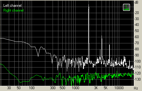 Перейдем к измерениям гармонических искажений. Мы измеряем КГИ в логарифмическом масштабе, так как восприятие человека линейно пропорционально логарифму. Для ориентира -20 дБ = 10%, -40 дБ = 1%, -60 дБ = 0,1%.
