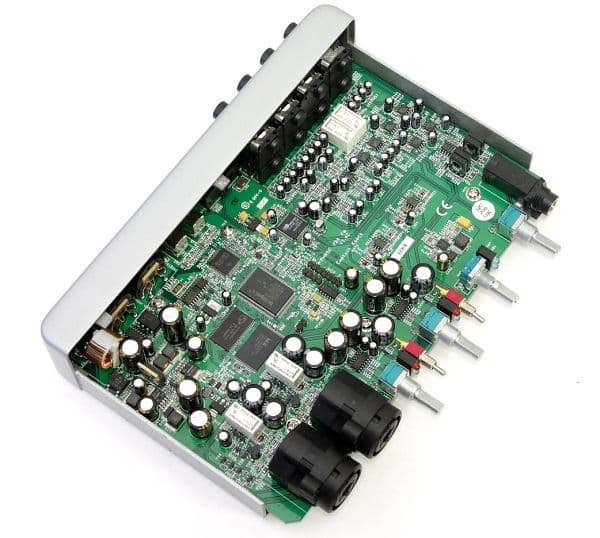 Очень интересно было послушать особенности микрофонных входов, так как их разрабатывала компания Sound Performance Lab, специализирующаяся на разработке ламповых, аналоговых и мастеринговых приборов. И действительно, на записи совершенно ясно слышен характер работы микрофонных предусилителей, слегка поджимающих и смягчающих запись. Для речи и вокала это смотрелось интересно, но при записи трубы появлялся эффект изменения тембра за счет слышимых привнесенных гармоник, несмотря на то, что уровень усиления был далек от максимума. Будем считать, что встроенная оригинальная аналоговая обработка микрофонных входов — это, скорее, плюс, так как найти обычный микрофонный предусилитель для записи в home/project студии не представляется проблемой, например, в том же микшерном пульте.