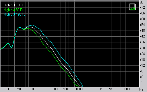 На измеренном графике АЧХ сабвуфера можно видеть диапазон воспроизводимых частот, составляющий 45 Гц — 120 Гц.