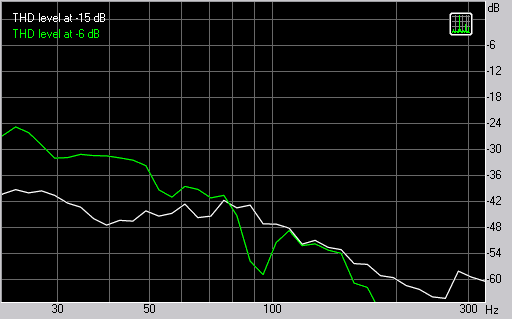 На спектрограммах гармонических искажений (2+3 гармоники) мы видим уровень искажений, в общем случае составляющий 6%.