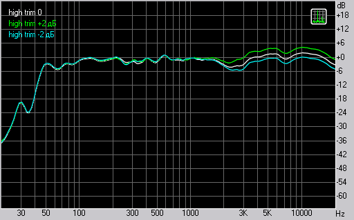 Согласно паспортным характеристикам тумблер High Trim изменяет амплитуду сигнала на ±2 дБ на частоте 2 кГц. Судя по нашим измерениям указанные изменения производятся на частоте 2,2 кГц.