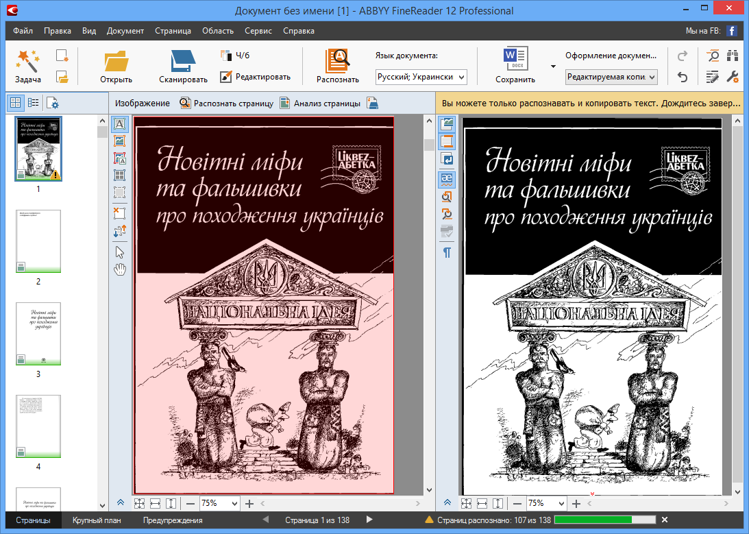 В отличие от прежней версии, также не происходит перелистывания страниц по мере распознавания или при начальной загрузке документа, если автоматическое распознавание отключено. В Abbyy FineReader 12 Professional документ загружается и разбивается на страницы практически мгновенно, а их эскизы строятся только по мере ручного пролистывания в левой панели. Кроме всего прочего, тем самым экономятся вычислительные ресурсы, причем, довольно ощутимо на больших многостраничных документах.