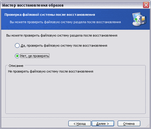 На предпоследнем шаге мастера можно включить проверку целостности файловой системы после восстановления.