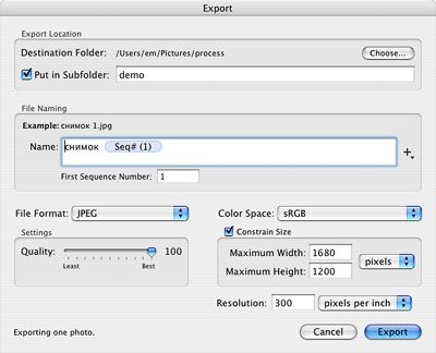 При экспорте можно задать формат изображения (поддерживаются JPEG, TIFF, PSD и DNG), цветовое пространство, максимальный размер по горизонтали и вертикали, а также достаточно гибко сформировать имя файла.