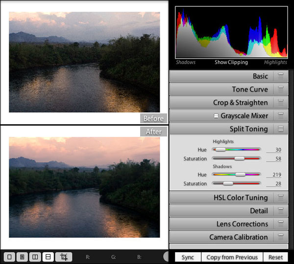 Split Toning, как это следует из названия панели, позволяет произвести сплит-тонирование фотографии — придать разные оттенки светлым частям и теням. Этот эффект можно применять не только к фотографиям в оттенках серого, но и к полноцветным изображениям, что позволяет в некоторых случаях достигать определенного художественного эффекта.