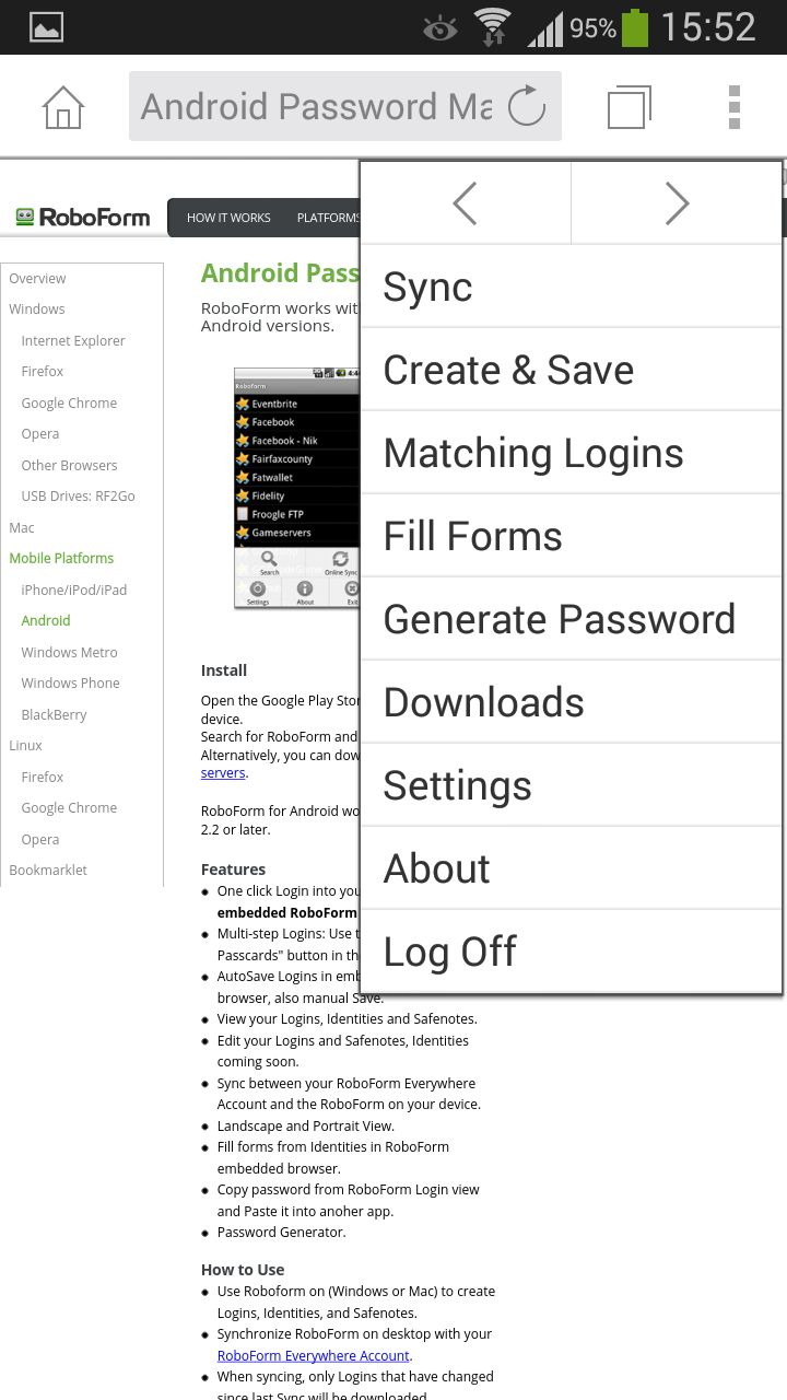 Для навигации по сайтам используется встроенный браузер RoboForm. Его нельзя назвать полновесной заменой стандартному интернет-навигатору: он относительно менее удобен и не столь функционален. Однако можно установить дополнение для мобильных браузеров Firefox и Dolphin. Chrome, почему-то, в данном списке не числится.