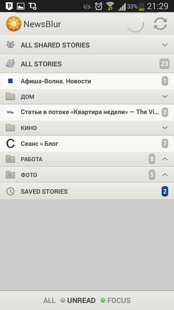 NewsBlur в мобильном исполнении претерпел существенные изменения, и часть функций доступна лишь в режиме чтения. Вышеназванная особенность здесь реализована в разделе Focus. Но режима тренировки, который позволяет выбрать ресурсы для первоочередного чтения, нет. То же самое относится к папкам. Как таковые, в NewsBlur они обозначены, но возможности по категоризации отсутствуют.
