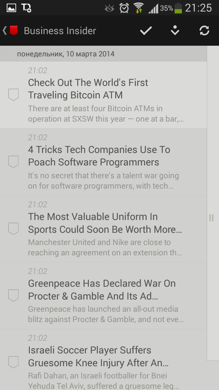 При переходе на канал отображается список, который можно отметит как прочитанный. Что касается собственно чтения, особых проблем не наблюдается, читать вполне комфортно. Список дополнительных команд стандартен: добавить в избранное, «лайкнуть», открыть оригинал публикации. Возможна интеграция с Facebook, Google+, Twitter (поделиться ссылкой), Digg, Instapaper и Pocket (добавить в закладки).