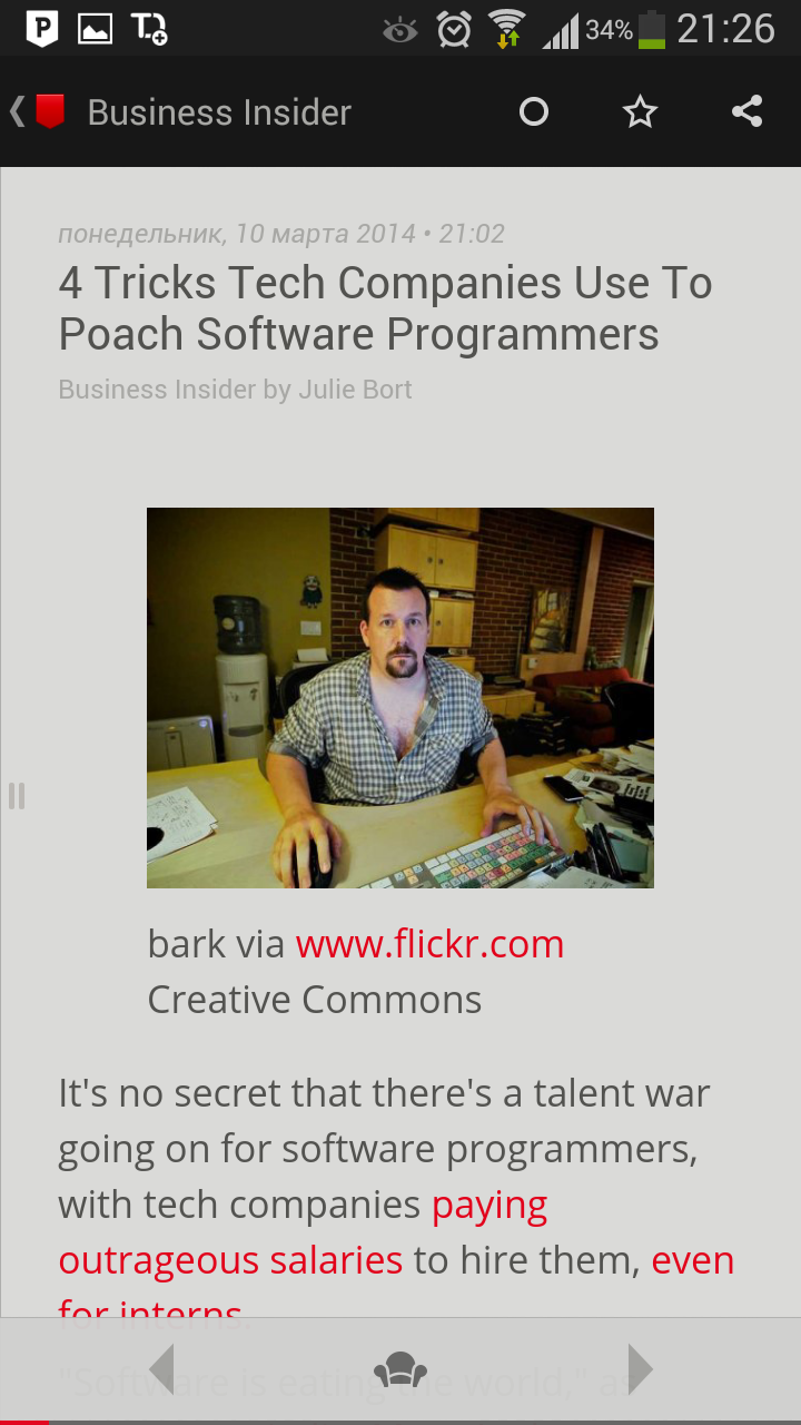 Одно из достоинств InoReader — возможность просмотра полной версии публикации в окне приложения без обращения к внешнему браузеру. Однако имеет место странность: изображения в материалах зачастую доступны ссылки на вложения, просмотреть их возможно лишь через внешнее приложение. Список публикаций доступен только в одном варианте отображения (в веб-версии их 4), вместо картинок также отображаются значки вложений.