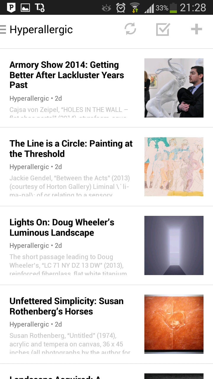 При этом следует отметить, что режим отображения списка публикаций переключить нельзя. В единственном варианте отображается дата, заголовок, краткое описание. Для сравнения, в «родном» клиенте Feedly предусматривается четыре режима отображения, в том числе с выводом изображений.