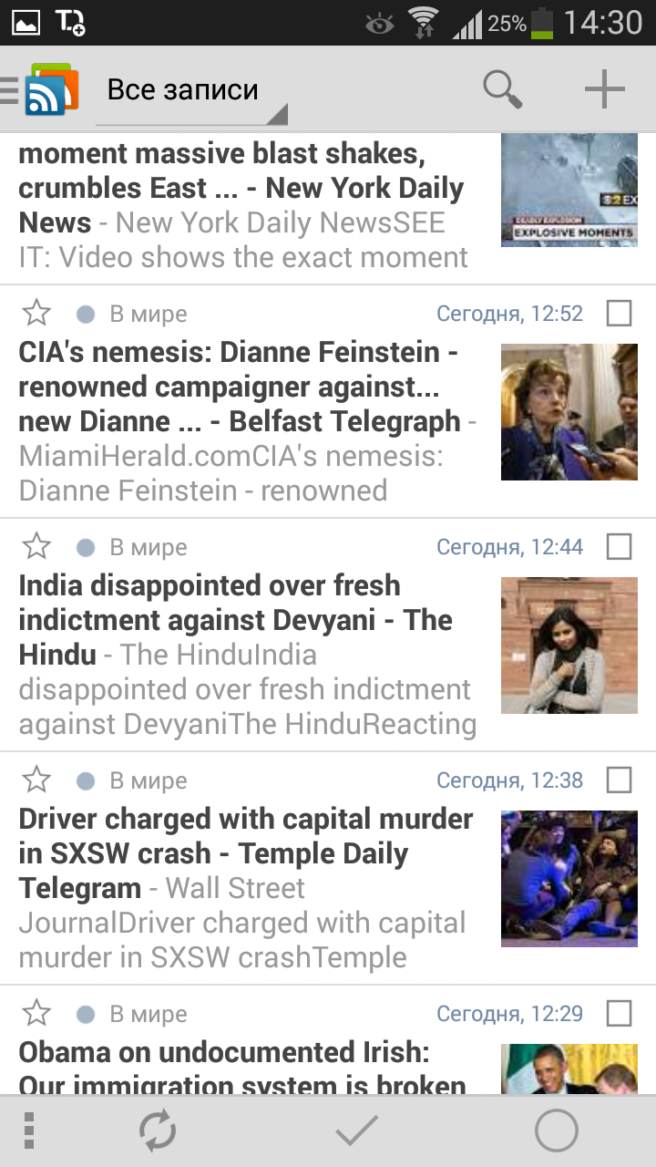 В режиме просмотра списка доступны следующие опции: синхронизация, отметка о прочтении, показ непрочитанных публикаций, сортировка. Замечено, что при работе со списками не всегда отображаются картинки — причем вне зависимости от статуса интернет-подключения.