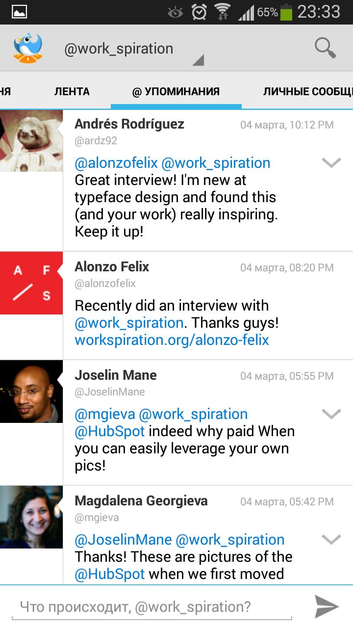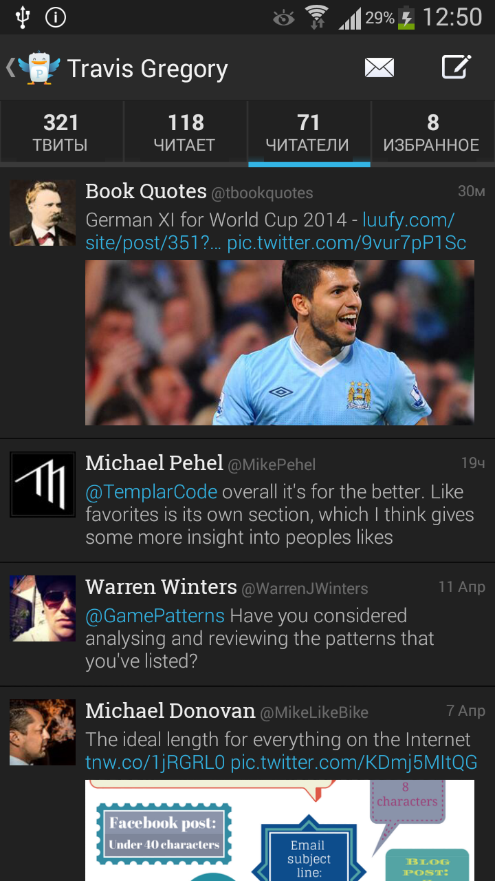 При навигации понравились следующие моменты. При просмотре твитов каждый из них можно развернуть для чтения переписки. Изображения разворачиваются по ширине экрана. Уведомление о новых твитах доступно в виде дополнительной строки вверху экрана (хотя также ожидаемо было увидеть счетчики непрочитанных сообщений).