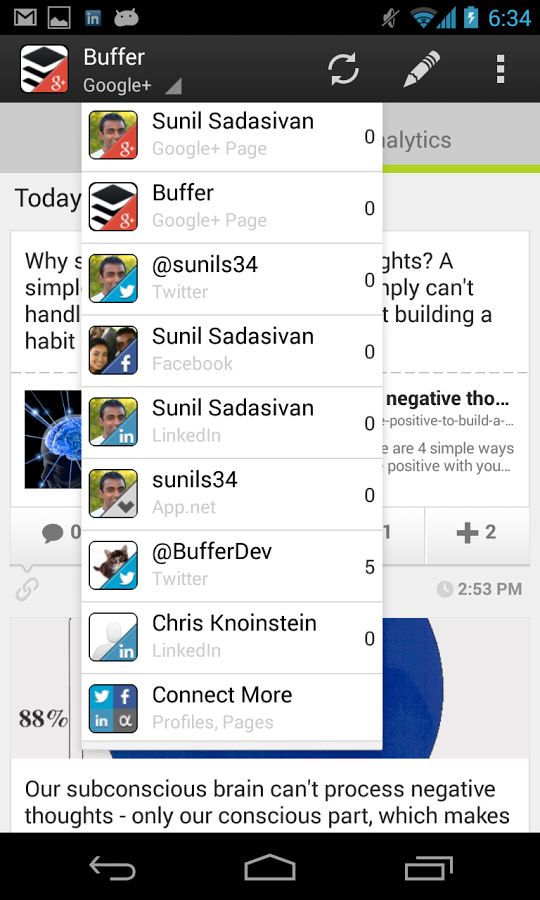 Второй способ публикации — команда Share — Add to Buffer в используемом клиенте. Подобная функция есть во Flipboard, Taptu, Evernote, Pocket, Instapaper, Pulse, Hootsuite, Tweetcaster, Feedly и других мобильных приложениях (всего более 50 вариантов интеграции).
