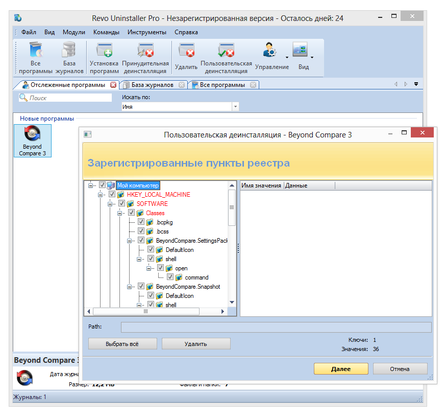 Имеется два варианта удаления приложений — стандартное и расширенное. Расширенная деинсталляция предполагает поиск оставшихся элементов (файлы, ключи реестра) на компьютере. Мониторинга установки нет, что еще больше утверждает IObit Uninstaller в большей степени как портативную утилиту.