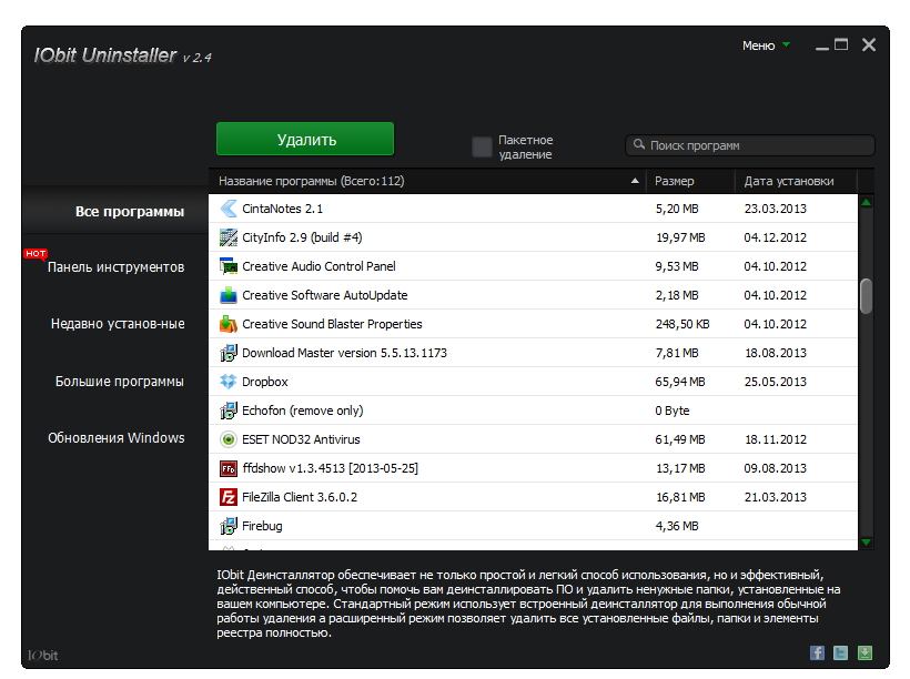 IObit Uninstaller, список установленных программ