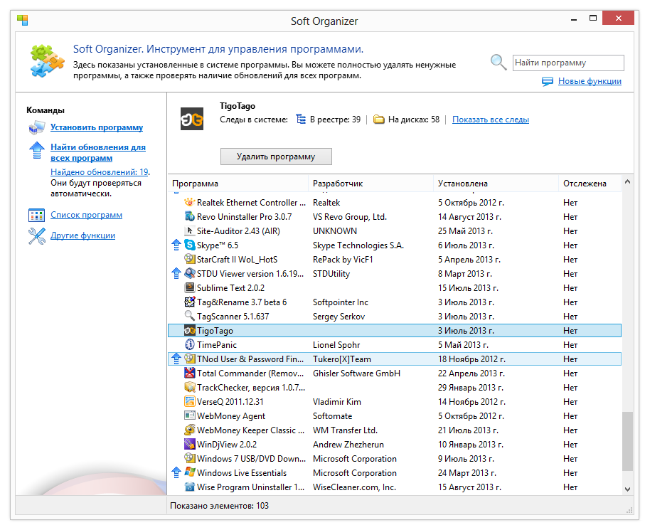 Утилита представлена окном без вкладок, со списком установленных программ. На функциональности подобный минимализм не сказался — с точностью наоборот. Выбрав нужный элемент, можно быстро узнать, какие следы программа оставила в системе. Список можно сортировать и группировать по разработчикам, возрасту, статусу отслеживания, наличию обновлений. Кстати говоря, массовый поиск обновлений для приложений, реализованный в Soft Organizer, очень удобен. Возможно также пакетное удаление, для этого достаточно выбрать в списке несколько элементов и нажать кнопку «Удалить программы».