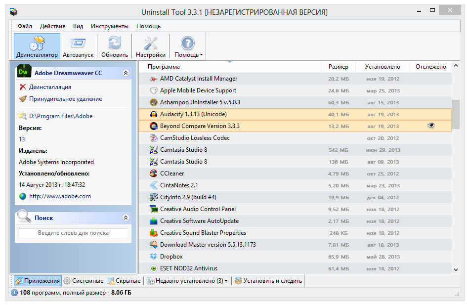 Uninstall Tool — еще одна программа для быстрой деинсталляции приложений, включая скрытые и системные компоненты, мониторинга установки, удаления ошибочных записей и элементов автозапуска.