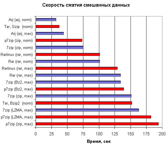 Скорость сжатия текста. Данное тестирование показывает скорость обработки множества файлов, приблизительно одинакового типа и объема. Здесь и далее на всех диаграммах синим цветом показаны архиваторы для Windows, а красным - для Linux.