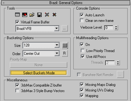 Brazil имеет альтернативный стандартному "максовскому" VFB (Virtual Frame Buffer) - Brazil VFB. Самая первая закладка Brazil: General Options предлагает различные настройки, относящиеся в основном к Brazil VFB и консоли.
