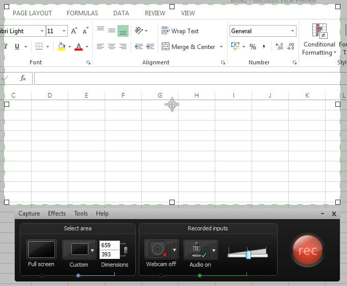 При записи можно захватить как весь экран («Full screen», то есть по размеру вашего монитора), так и определенный регион (выпадающее меню рядом с кнопкой «custom»). Выбрать подходящий режим можно на панели инструментов «Recorder» в секции «Select area». Помимо прочего, вы можете свободно перемещать область для записи, изменять размер с помощью квадратов по краям. Активная область записи имеет яркий фон, неактивная область затемнена. Будьте внимательны при установке ручных параметров и убедитесь, что значок замка на кнопке «Lock» закрыт, иначе видеозапись будет расплывчатой и, как итог, непригодной к просмотру.