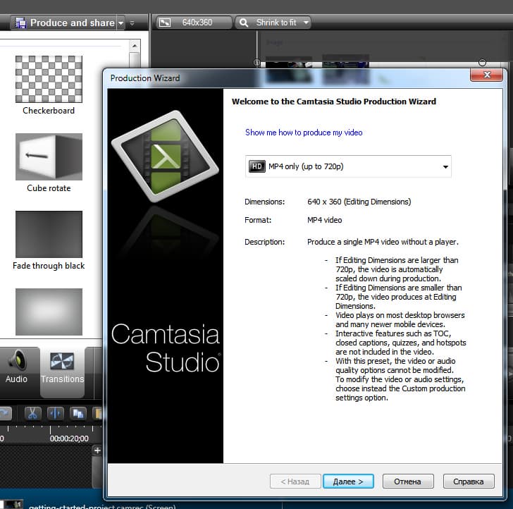 Следуйте указаниям Production Wizard, нажмите кнопку «Готово», дождитесь окончания рендеринга проекта. По окончании процесса откройте видеофайл, проверьте, корректно ли он воспроизводится. Если не проигрывается видео, аудио или качество сжатия вас не устроило, пересмотрите настройки сохранения формата.