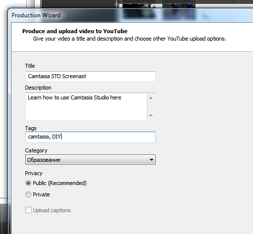 Также вы можете опубликовать видео непосредственно на видеосервисе YouTube. Для этого на первом этапе сохранения (после нажатия «Produce and Share»), выберите опцию «Share to YouTube», нажмите «Далее» и укажите ваши имя пользователя и пароль на сервисе. В следующем окне заполните поля с описанием вашего проекта: Title, Description, Tags, Category и обязательно отметьте флажком «Public (Recommended)», если хотите сделать свое творение общедоступным.