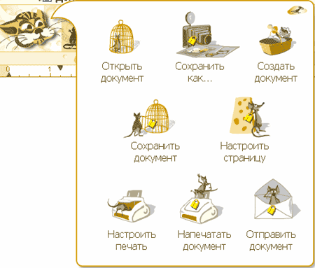Почему-то под этой норой расположена стандартная дискета - да, она и действие выполняет стандартное, сохраняя открытый документ на диск. Вот только непонятно, зачем действие сохранения не только дублируется, но повторяется трижды. На том месте, о котором я уже сказал. На верхней полоске окна, ближе к левой границе (здесь дискета смотрится вполне привычно и на месте). И еще в панели управления файлами, которая открывается, если щелкнуть кота по носу. Вот только на этой панели вместо дискеты изображена мышь, стоящая перед клеткой. Если бы не подпись к этому изображению, понять, для чего оно предназначено, было бы весьма затруднительно.