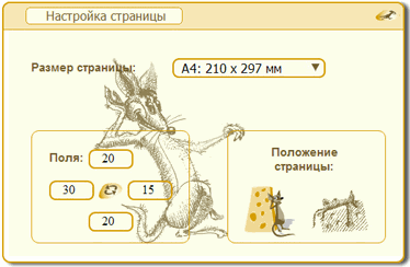 "Настроить страницу" - следующая кнопка панели управления. Через нее можно назначить размеры полей, вид страницы - альбомную или книжную. И все эти настройки выполняются на фоне веселого мышонка. Подобно настройке страницы выполняется и настройка печати. Здесь можно выбрать принтер, установить количество копий, выполнить настройку принтера (при этом открывается стандартное окно системы) и отсюда же отправить документ на печать. Но отсутствуют возможность выбора страницы или диапазона страниц для печати и настройка параметров печати.
