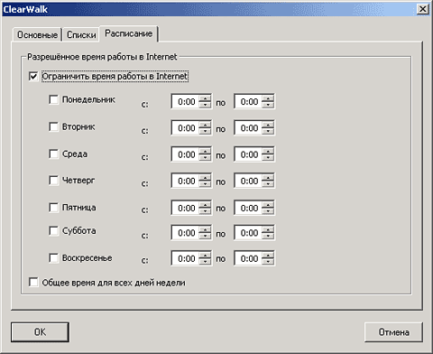 Второй вариант клиентской части - специальный плагин. Он рассчитан только на применение совместно с браузером Internet Explorer. С одной стороны, это плохо, поскольку ребенок может в любой момент установить другую программу для просмотра веб-сайтов, дистрибутив которой можно легко найти в Интернете. Впрочем, решить эту проблему легко. Достаточно настроить на домашнем компьютере систему разделения прав, запретив ребенку инсталлировать ПО. Есть у рассматриваемого плагина и другая сторона - увеличенная функциональность. Во-первых, он позволяет пользователю самостоятельно вести списки разрешенных и запрещенных ресурсов, причем вносить в них адреса по своему усмотрению. Это очень удобно в тех случаях, когда мнение человека о том, что можно и что нельзя, не совпадает с общепринятым. Другой интересной особенностью клиентского плагина системы ClearWalk является возможность ограничения времени работы в Интернете. То есть для каждого дня недели (или для всех дней сразу) устанавливается период, в течение которого разрешен просмотр веб-сайтов. При невыполнении этого условия программа будет блокировать доступ абсолютно ко всем проектам. Естественно, настроить плагин, а также отключить его можно, только зная логин и пароль. Сохраняя эти данные в секрете, родители могут спокойно разрешать своим детям работать в Сети самостоятельно.