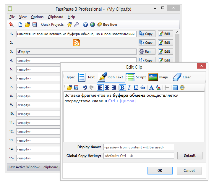 FastPaste — программа с простым и приятным интерфейсом. Речь идет не о «красивостях», а о том, что все элементы выстроены грамотно и интуитивно. Имеется 30 ячеек для хранения, в каждую из которых можно добавить клип для последующей вставки. Поддерживаются не только вставка из буфера обмена, но и пользовательский ввод и загрузка изображений (JPG, PNG, GIF, BMP, TIFF). Для работы с текстом доступен удобный WYSIWYG-редактор с несложным форматированием.