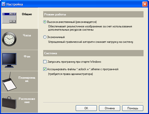 Chameleon Clock – многофункциональные часы, которые могут заменять штатный инструмент системы Windows в системном лотке, а также располагаться на рабочем столе. Сразу после установки программы вам задается вопрос, куда вы хотите поместить новые часы. В обоих случаях их внешний вид практически не отличается друг от друга. Если вы располагаете часы на рабочем столе, то можете оставить значок программы в системном лотке. Настройки программы позволяют указывать большое количество действий, осуществляемых при двойном щелчке мышью по данному значку. По умолчанию открывается диалоговое окно настроек Chameleon Clock.
