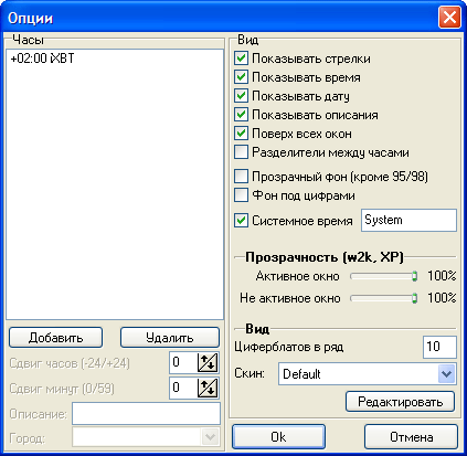 Вы можете скрывать стрелки часов, дату, описания. Рабочее окно может менять свою прозрачность. При этом допускается раздельное управление прозрачностью для активного и неактивного окна.