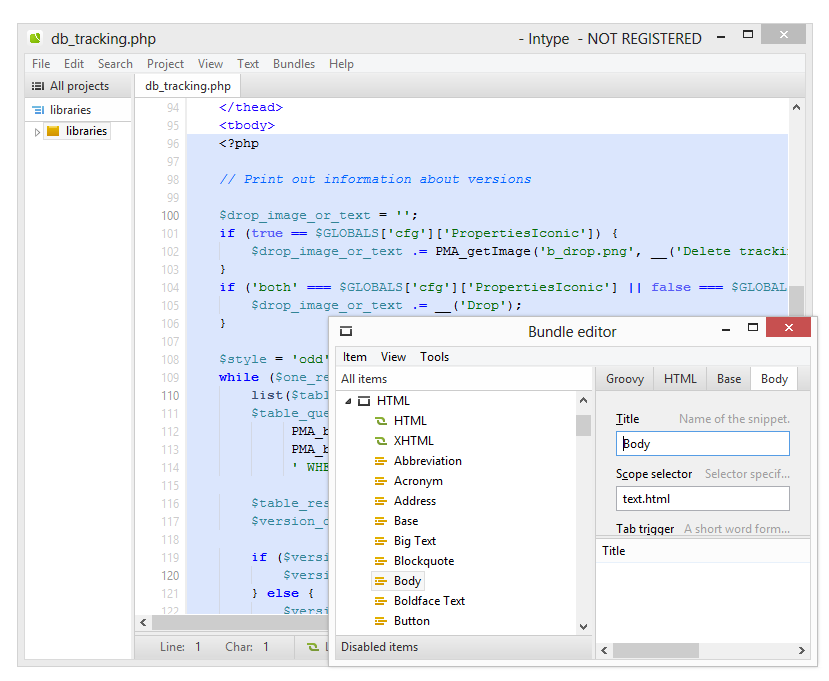 EditPlus изначально поддерживает форматы HTML, CSS, PHP, ASP, Perl, C/C++, Java, JavaScript и VBScript, но можно расширить список. Файлы STX отвечают за синтаксис, ACP — автодополнение, CTL — сниппеты (доступны через Cliptext Window, Alt + Shift + 1).