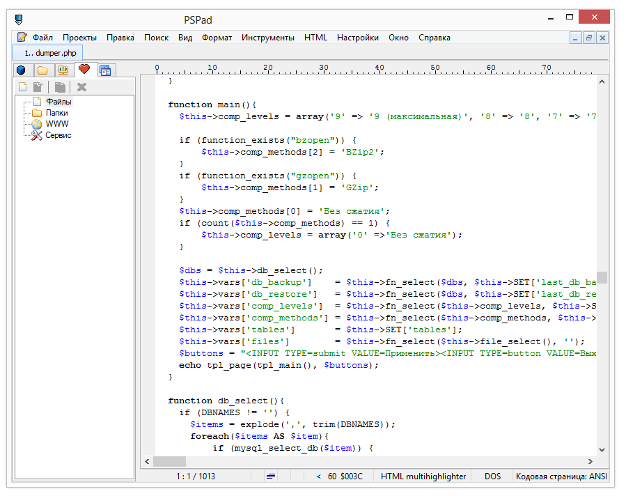 Тем не менее, форматирование HTML — не главный профиль PSPad. Так, из дополнительных инструментов можно обнаружить HEX-режим, хеш-генератор, генератор текста, сравнение текстовых файлов и множество других модулей. Очень востребованная возможность — проводник кода, который выводит список переменных, классов, функций и т. п. в виде дерева (Shift+Ctrl+E). Поиск доступен не только внутри файла, но и внутри определенной папки.