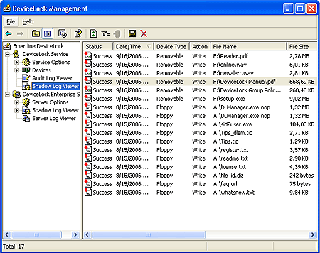 Предусмотрена и дополнительная защита от администратора. В системе имеется и журнал для стертых данных теневого копирования. Теперь, когда записи теневого копирования удаляются из журнала, а содержимое файлов стирается из базы данных, информация об этих записях переносится в отдельный журнал Deleted Shadow Data Log. Для его просмотра есть специальный инструмент в DeviceLock Management Console.