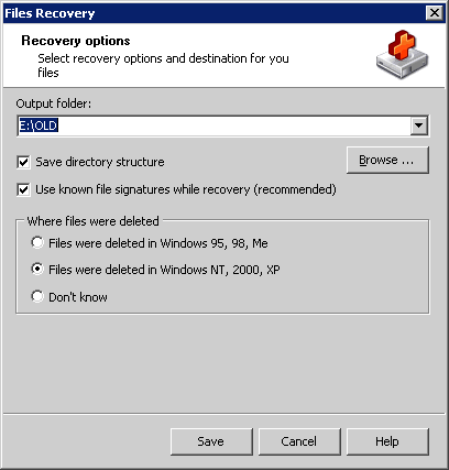 Восстановление выполняется путем выбора опции Recover. С помощью мастера производится настройка опций восстановления. Выбирается раздел диска, куда будут складываться восстановленные файлы (желательно выбирать логический диск, с которым в данный момент вы не работаете), ставится отметка, сохранять ли структуру папок, которые будут восстанавливаться. Нужно отметить, под какой операционной системой были сохранены восстанавливаемые файлы (либо указать, что система вам неизвестна). Если вы полностью доверяете программе, то выбрать опцию "Использовать известные сигнатуры файлов" - ее рекомендуется выбирать по умолчанию. Если вы отказываетесь от такого варианта, вам будет предложено выбрать обычный или альтернативный способ восстановления.