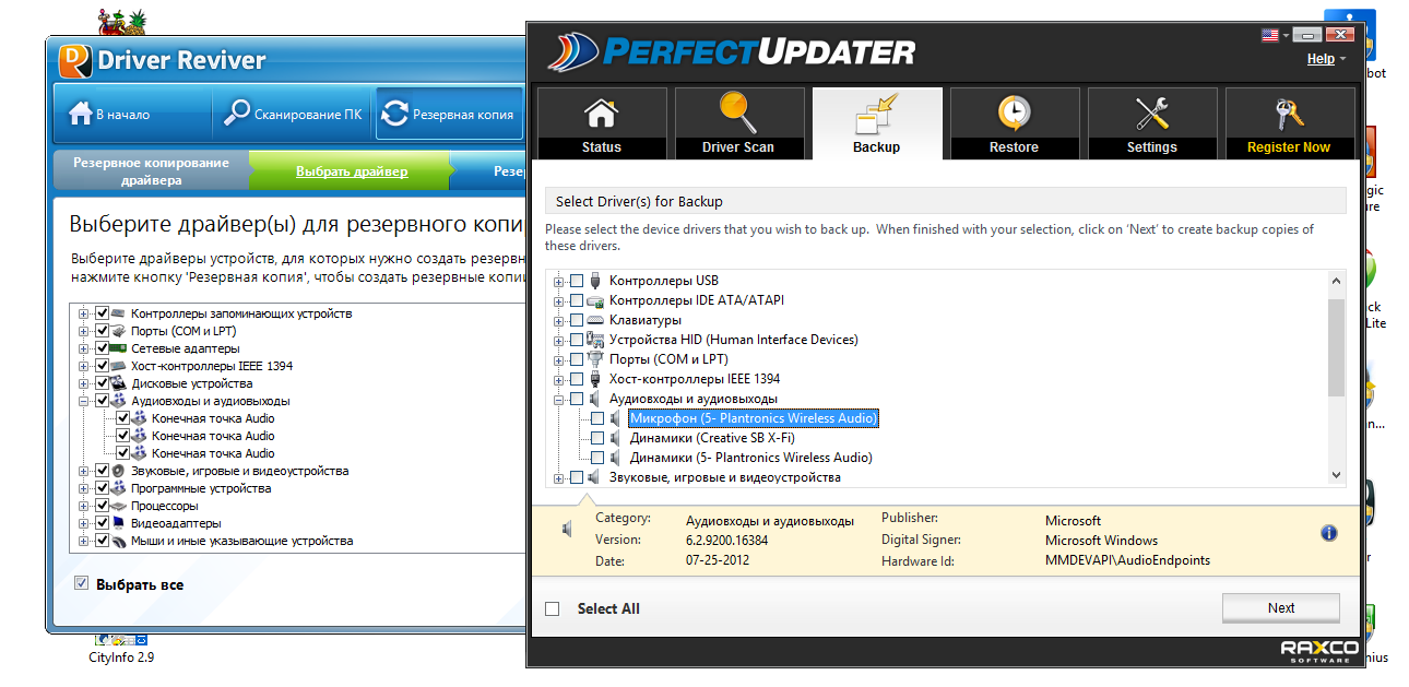 Схема очень напоминает Driver Reviver: пользователь может выбрать полный или выборочный бэкап. На данном этапе видны определенные различия между программами. Так, PerfectUpdater предоставляет подробную информацию, которая позволяет ознакомиться с ID устройства, производителем, датой выпуска драйвера, в то время как Driver Reviver умалчивает об этом.