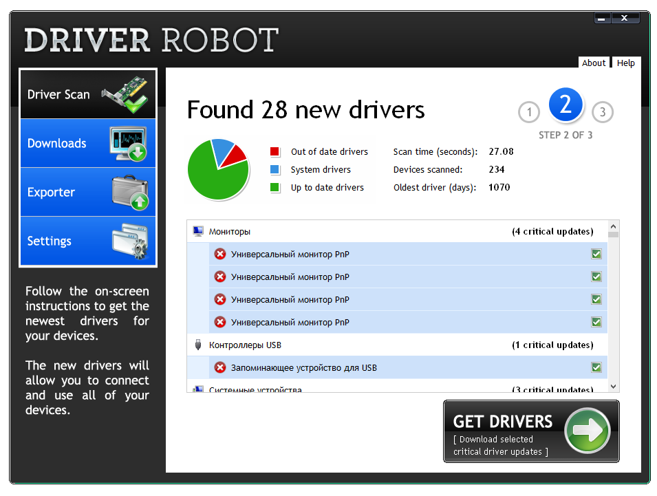 Тем не менее, косвенное подтверждение заявленной характеристике («Huge database») нашлось: по результатам сканирования Driver Robot выдал список из 28 устаревших (Out of Date) драйверов. Впрочем, универсальный монитор PnP упомянут четырежды, двухканальный контроллер — дважды, с десяток строк — для «фантомных», непонятных устройств.