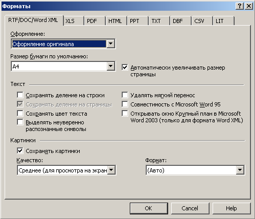 Для каждого формата можно выбрать настройки сохранения. Они находятся на соответствующей закладке диалога Форматы (настройки формата PDF находятся на закладке PDF и т.д.). Для того чтобы открыть диалог Форматы, нажмите на стрелку справа от кнопки Сохранить, выберите команду Опции... и в открывшемся диалоге нажмите кнопку Форматы...