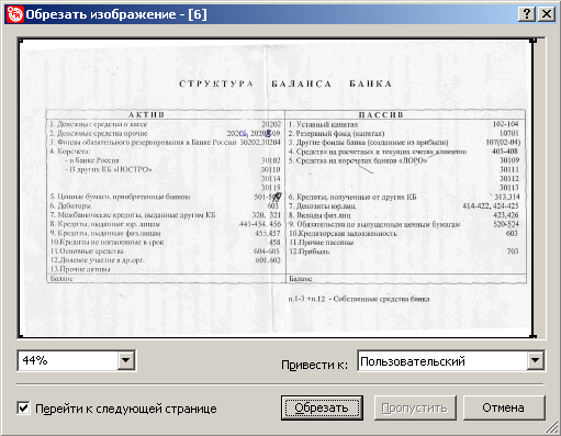 В ABBYY FineReader 8.0 появилась функция обрезания изображения; предусмотрены автоматический и ручной режимы. Функция предназначена для удаления чёрных полей (они иногда возникают при сканировании книг), для приведения страниц пакета к одинаковому размеру, для удаления с фотографий документов областей, не содержащих текста.