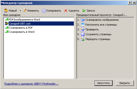 Автоматическая обработка документов - Процесс распознавания документов очень часто состоит из одного и того же набора операций. Например, сканирование, распознавание, сохранение распознанного текста в определённом формате. Для экономии времени пользователя в FineReader 8.0 предусмотрена возможность автоматизации однотипных действий. Для этого описано несколько наиболее распространённых сценариев обработки документов. Для запуска сценария достаточно просто нажать одну кнопку — вся остальная работа будет выполнена системой автоматически, в соответствии с настройками сценария.