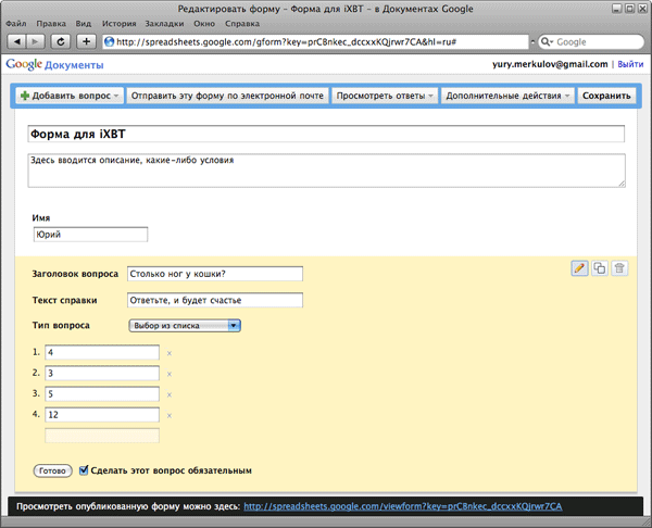 Еще один компонент Документов Google позволяет создавать формы для проведения различных опросов. С помощью незамысловатого редактора вы можете формулировать вопросы и принципы составления ответов. Каждая форма может состоять из нескольких вопросов. Ответы бывают следующих типов: простой текст, текст в виде абзаца, множественный выбор, флажки, выбор из списка, а также масштаб. Каждому вопросу можно присваивать атрибут «обязательный». В этом случае, пользователь будет вынужден указать какой-либо ответ, иначе заполнить форму не удастся.
